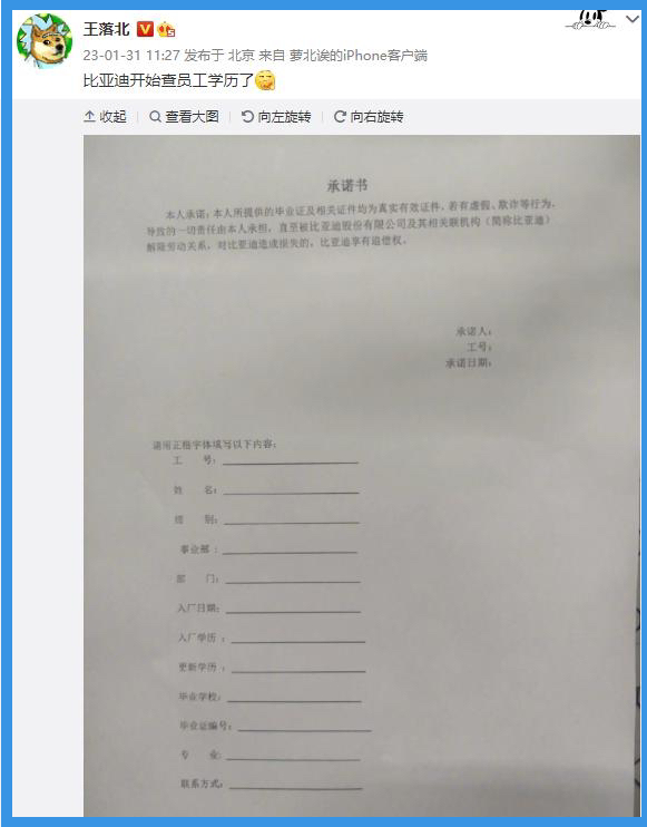 “比亚迪要求员工签订毕业证及相关证件的真实性承诺书”。
